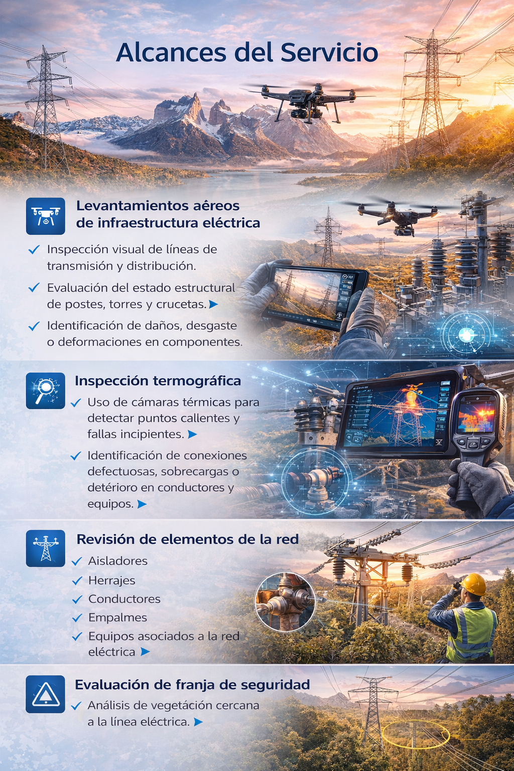 Nuestros levantamientos técnicos proporcionan información detallada sobre la condición de las redes eléctricas, facilitando la detección temprana de anomalías y optimizando la planificación del mantenimiento.